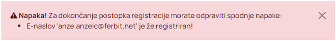Če bo obrazec izpolnjen napačno ali pa bo med registracijo prišlo do napake, se bo na vrhu strani prikazalo rdeče obvestilo z opisom napake.